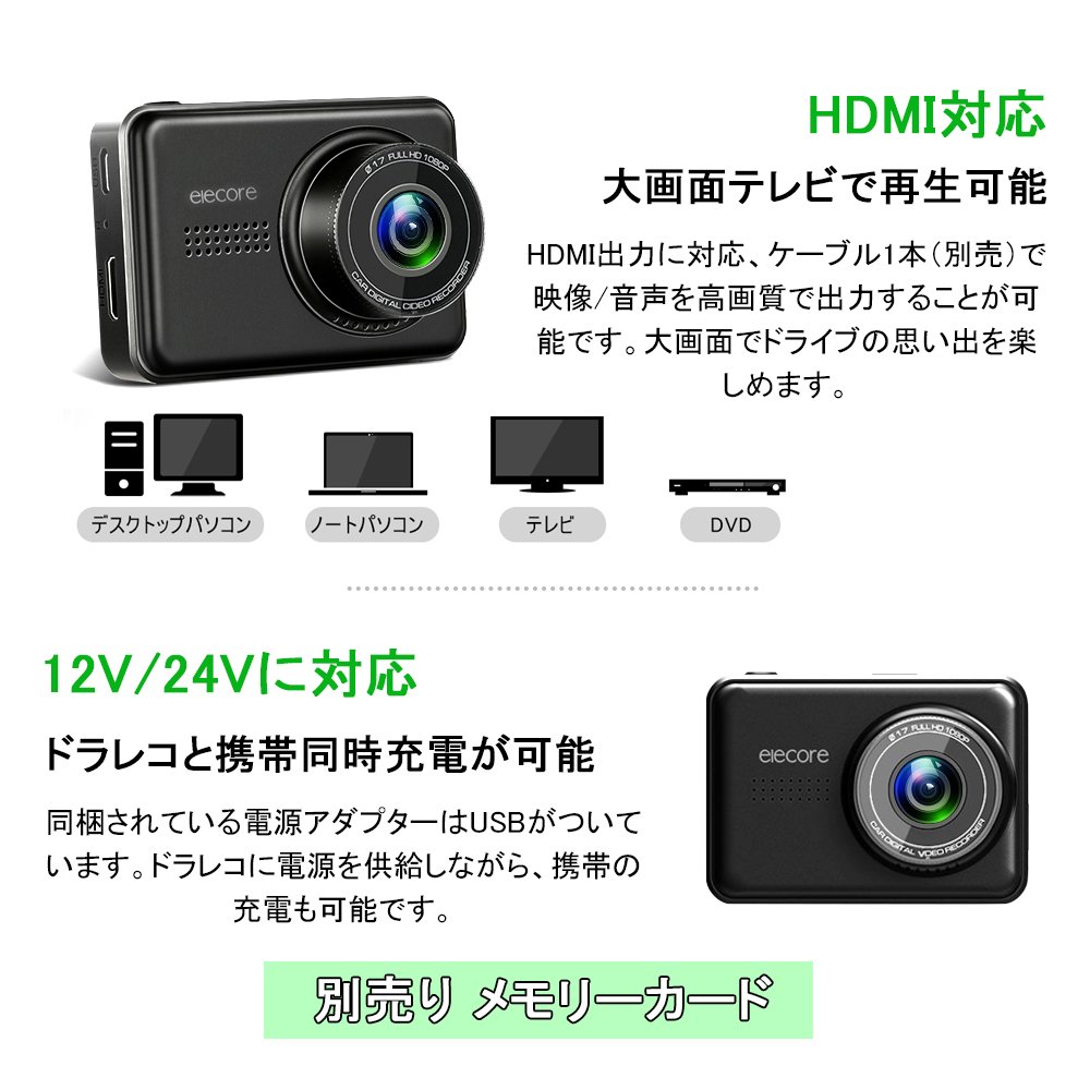 今はキャンペーン期間【1080P高画質】最先端?高感度SONY 323CMOSセンサー/6層ガラスレンズを採用して、140度A+等級高解像度広角レンズも搭載して、画面の歪みを抑えながらフルHD(1920x1080P)の高精細映像での録画が可能です。昼夜を問わず前車のナンバープレートなど細部の情報もより鮮明にはっきり記録できます。 【安定性?コスパに優れ】ドライブレコーダーの種類が多様化している現在で、シンプルなデザインを持ちながら高性能なドライブレコーダーのは希です。30fps録画に対応した、最新のNovatekチップ搭載しています。WIFI対応のモニターと比較してwifiの接続が切れる不安定な状況を心配なし!コンパクトながら高い機能性を持っているドライブレコーダーがこの価格ではお買い得です。 【基本機能も備える】ループ録画、G-センサー、WDR、エンジン連動、動体検知、駐車監視など、ドライブレコーダーとして備えるべき機能が揃えています。機能性には優れていて、大切な愛車を守ってあげます。純正ドライブレコーダーを大量仕入れたい皆さん、是非見逃さないでください。 【使い勝手が良い】多彩な機能を併せ持つなのに、操作ボタンの位置が分かりやすいため操作に難がないです。シガーソケットのUSBが2ポートついて、12V/24Vに対応しながら、ドライブレコーダーやスマホを同時に充電できます。操作画面も日本語に対応しています。初心者でも安心! 【コンパクト?永久保証】ルームミラーでドラレコがほぼ隠れてしまっていますので、視界の邪魔には全然なりません。コンパクトなのにいざという時威力抜群!保険紛争または法律上など有効な記録提供に役立ちます。本製品はご購入日より永久保証が付いています (本体のみ)。 中、間もなく元の値段に戻します。早い者勝ち!elecore ドライブレコーダー SONYセンサー 1200万画素